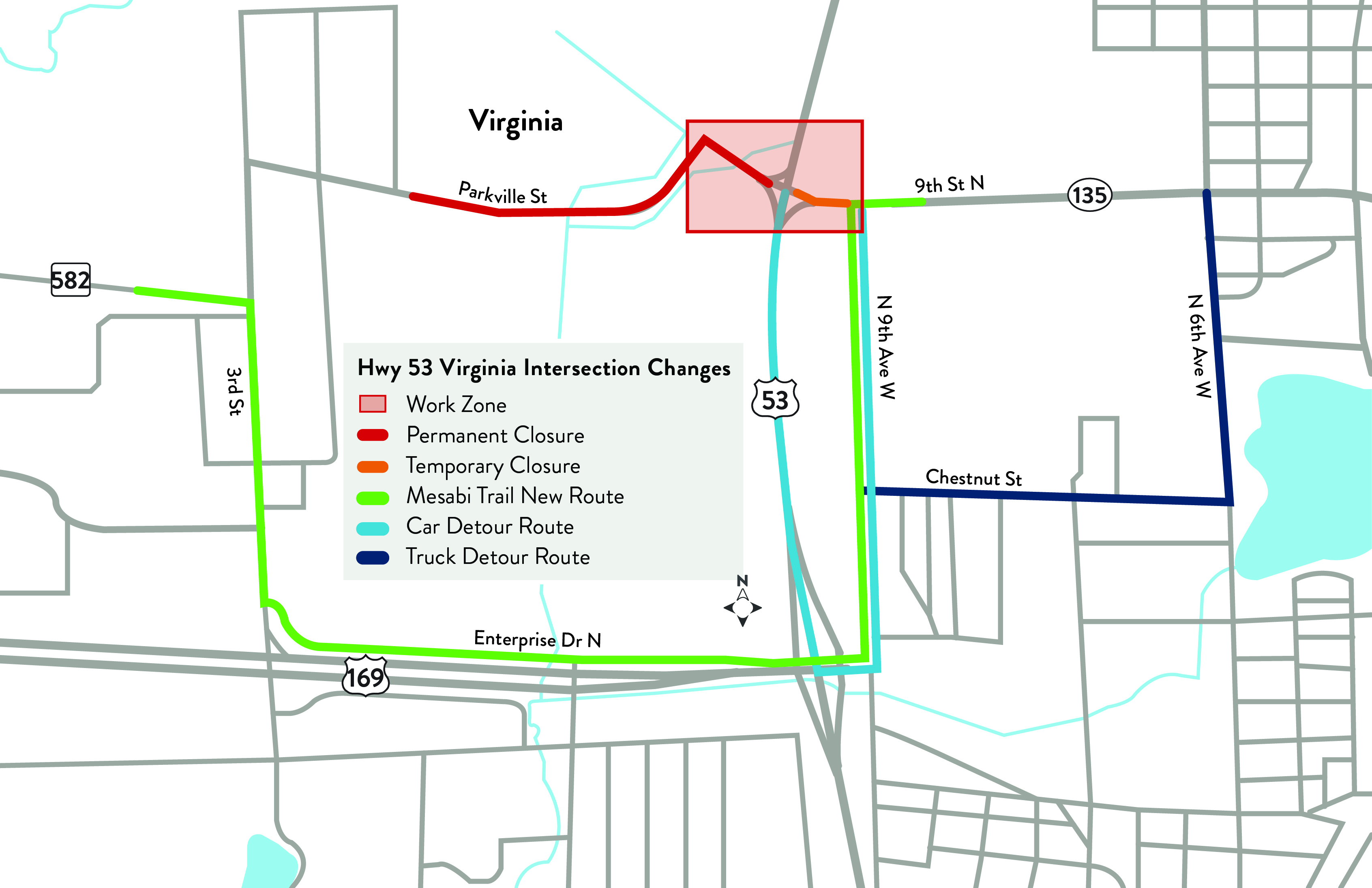 The 4-legged intersection of Hwy 53 and 9th Street N/County Road 102 in Virginia will be replaced with a 3-legged intersection of Hwy 53 and 9th Street. County Road 102 will be permanently closed and removed due to mining activity in the area. Work associated with intersection reconfiguration includes roadway and trail removal of County Road 102 from Hwy 53 to Parkville Road to the west, pavement replacement on 9th Street between Hwy 53 and Hoover Road, new traffic signal, pavement markings, replace outdated roadway signs, culvert repairs, storm sewer replacement, and ADA improvements.