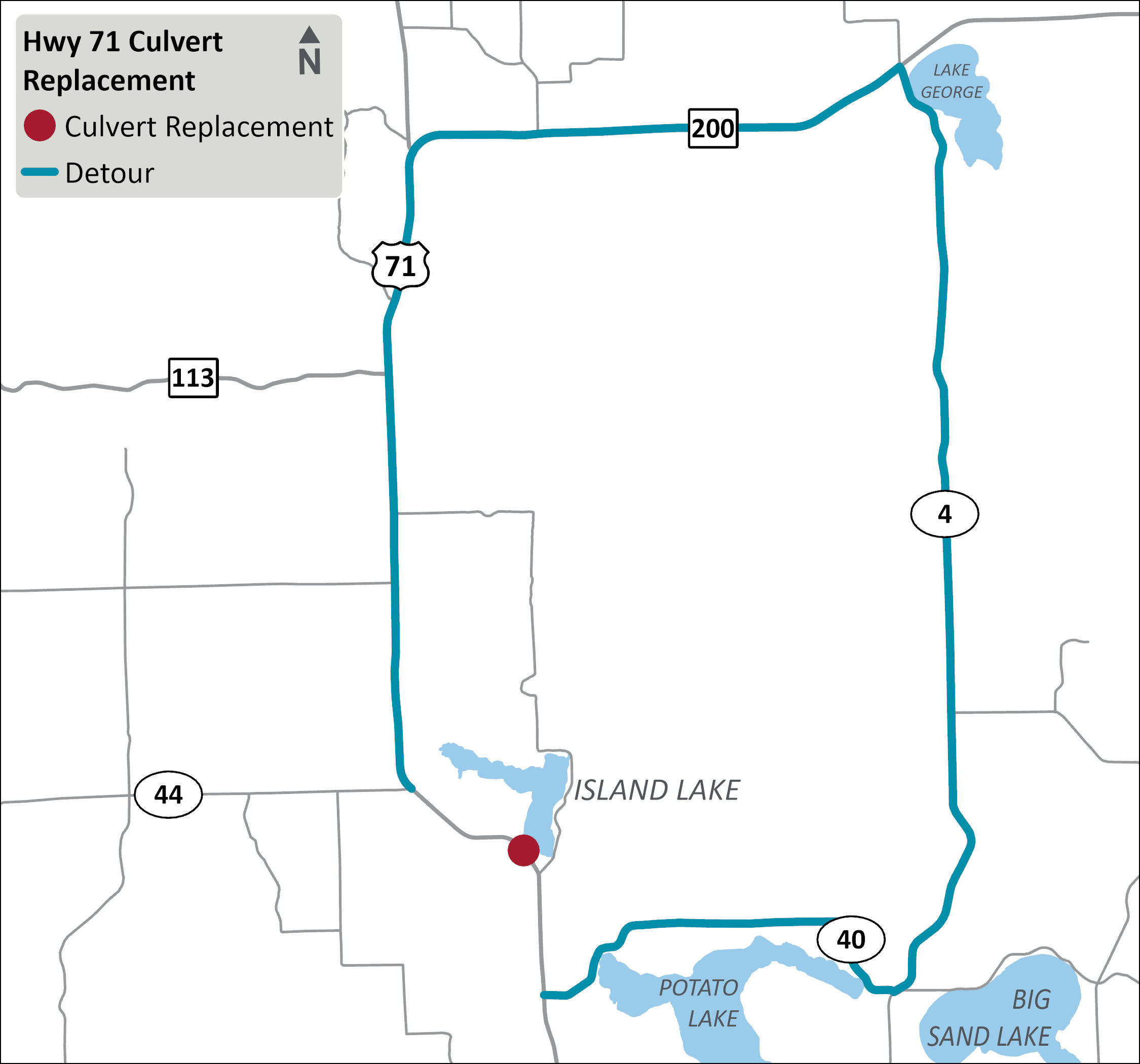 The detour will use Hubbard County roads 40 and 4 as well as Highway 200 and Highway 71. Property owners will have access to their homes and businesses during construction.
