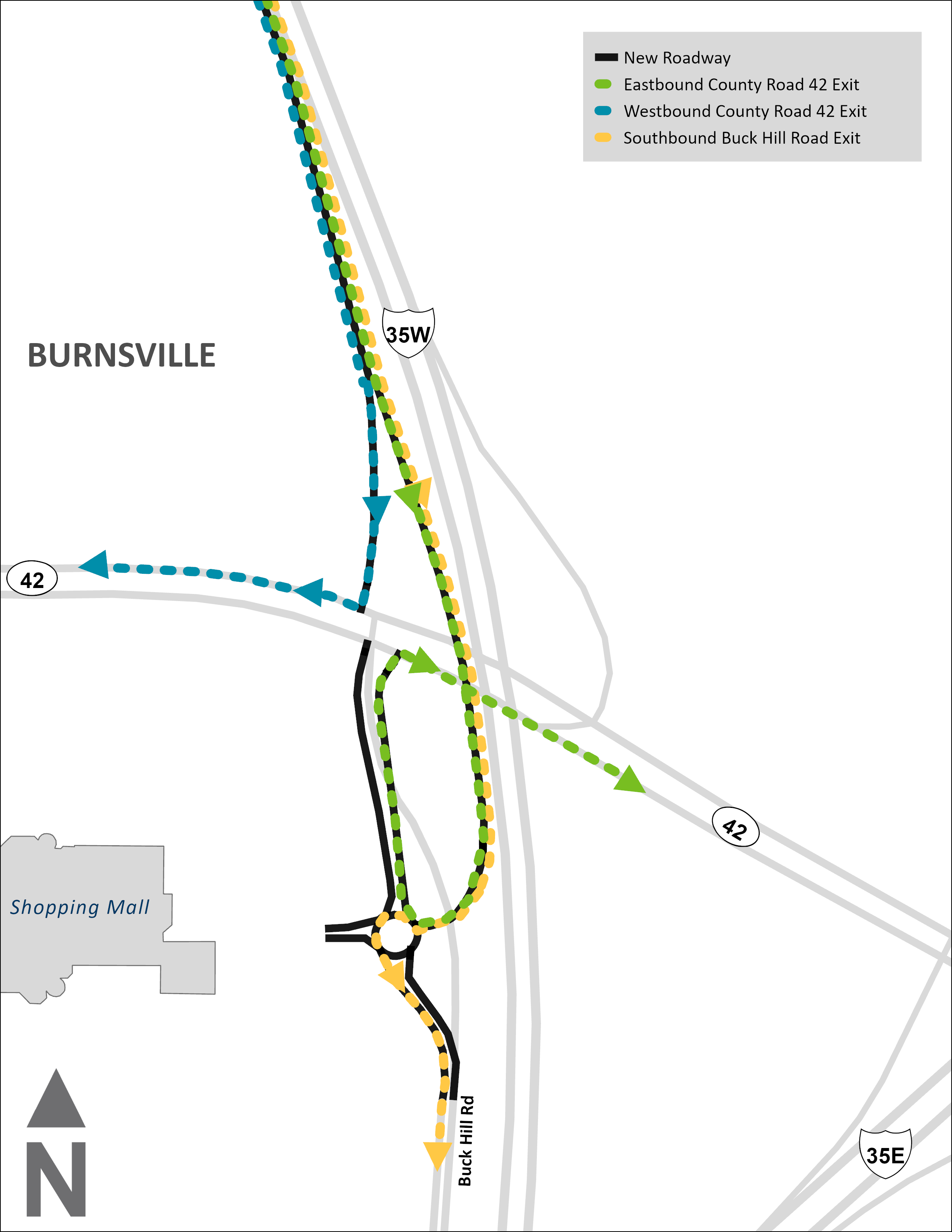 - Access to eastbound Co. Rd. 42 from southbound I-35W has permanently changed. Motorists will now use the newly constructed ramp at Buck Hill Rd. to access both eastbound Co. Rd. 42 and Buck Hill Rd.