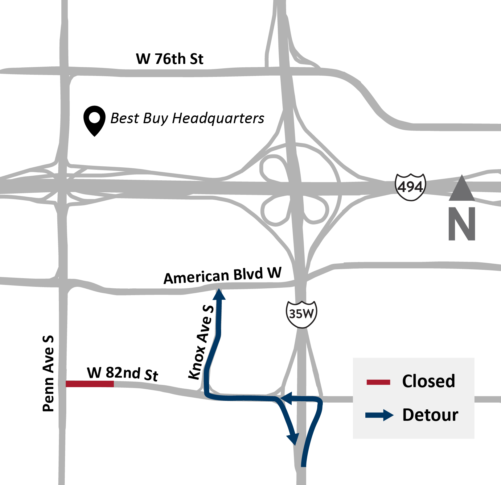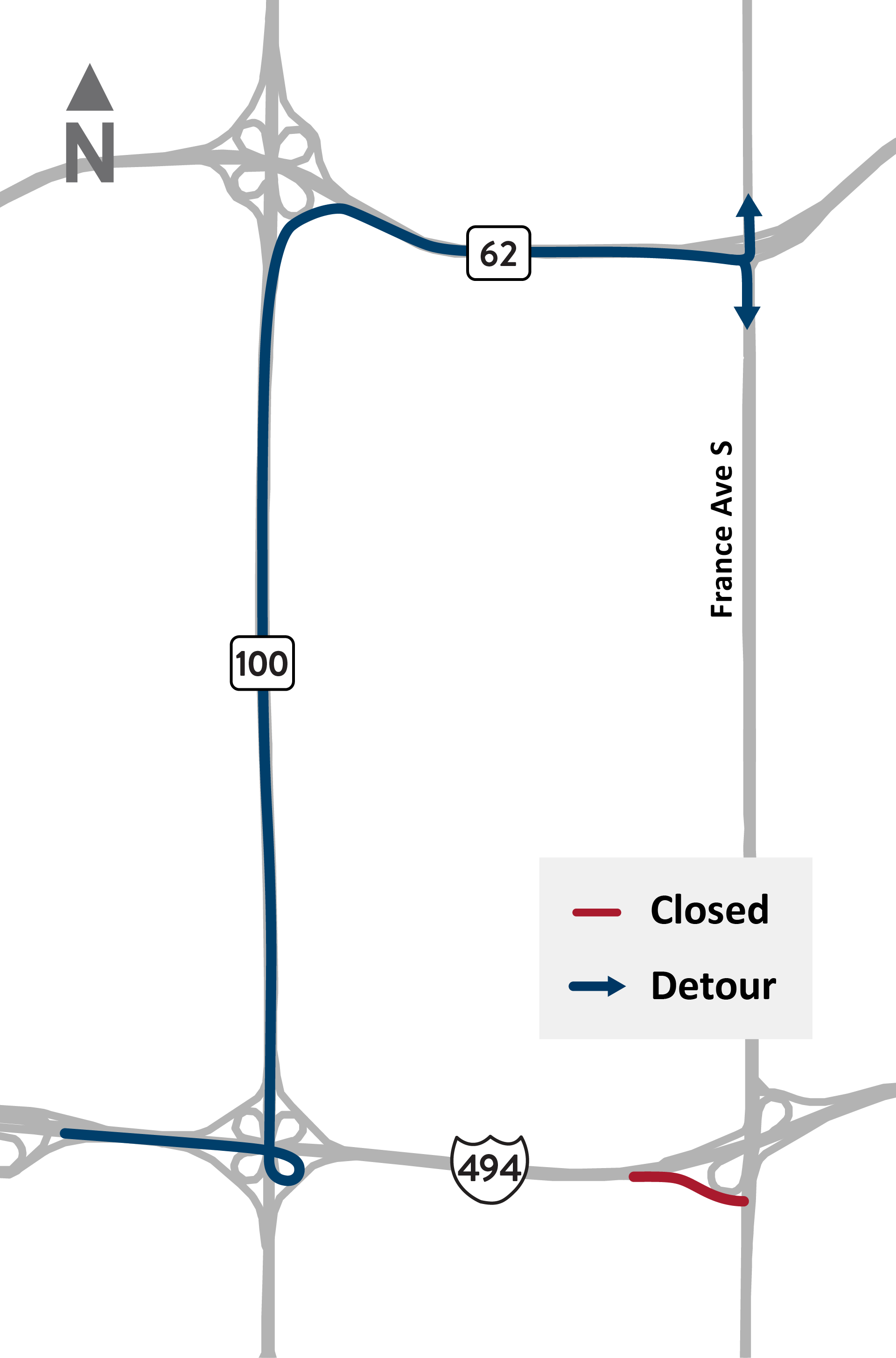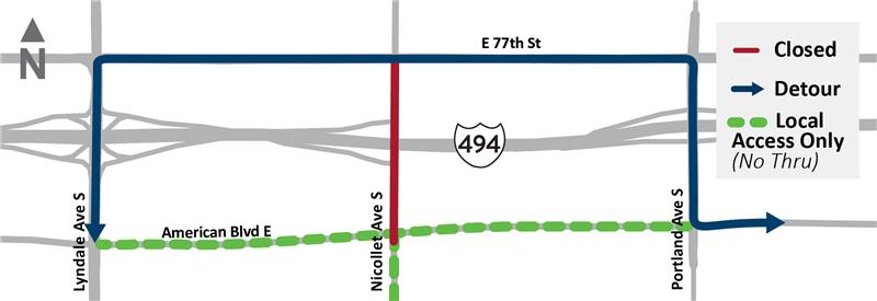 • Vehicle detour: Portland or Lyndale avenues to cross I-494