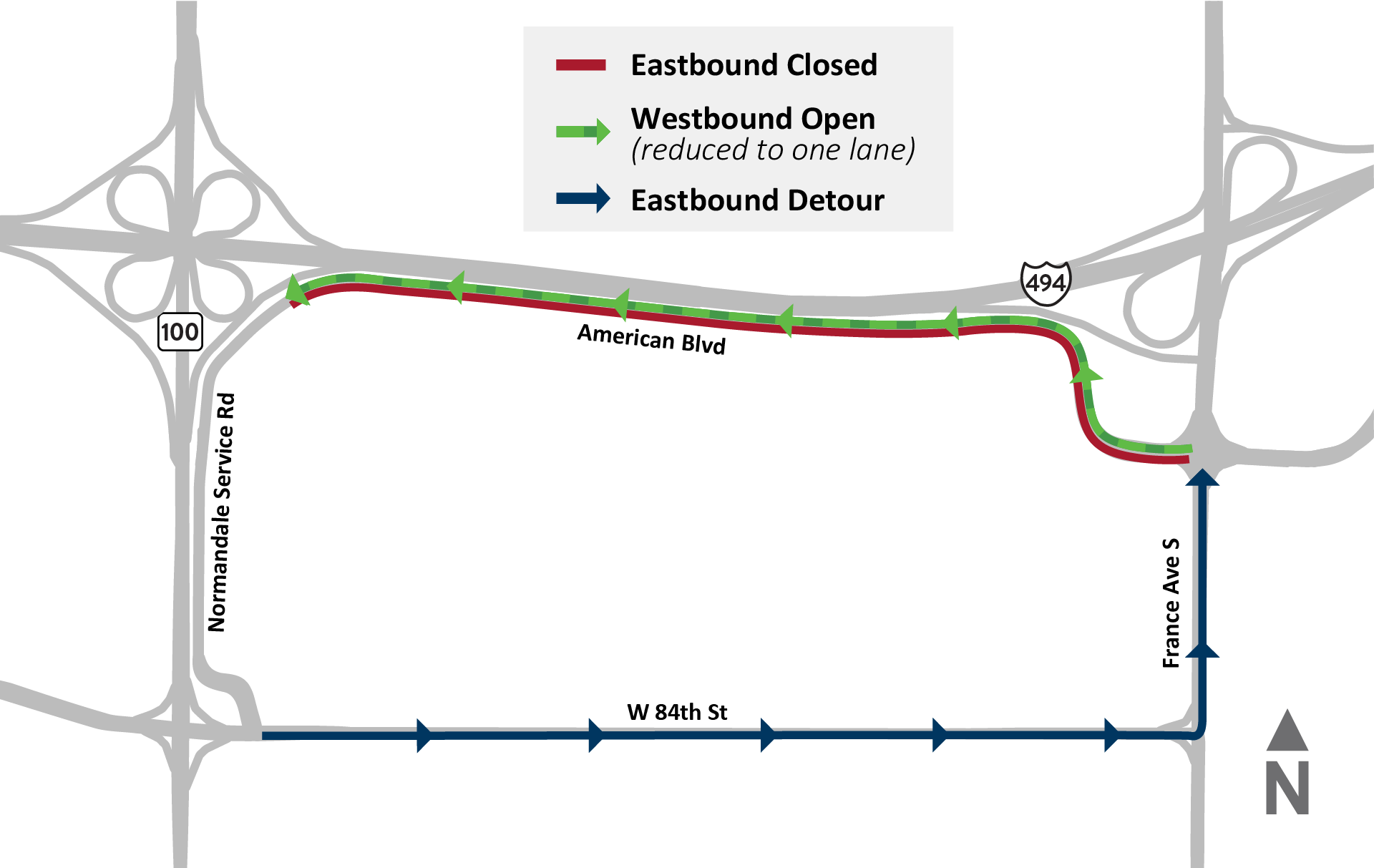 - Eastbound American Blvd. is closed between Hwy 100 and France Ave.