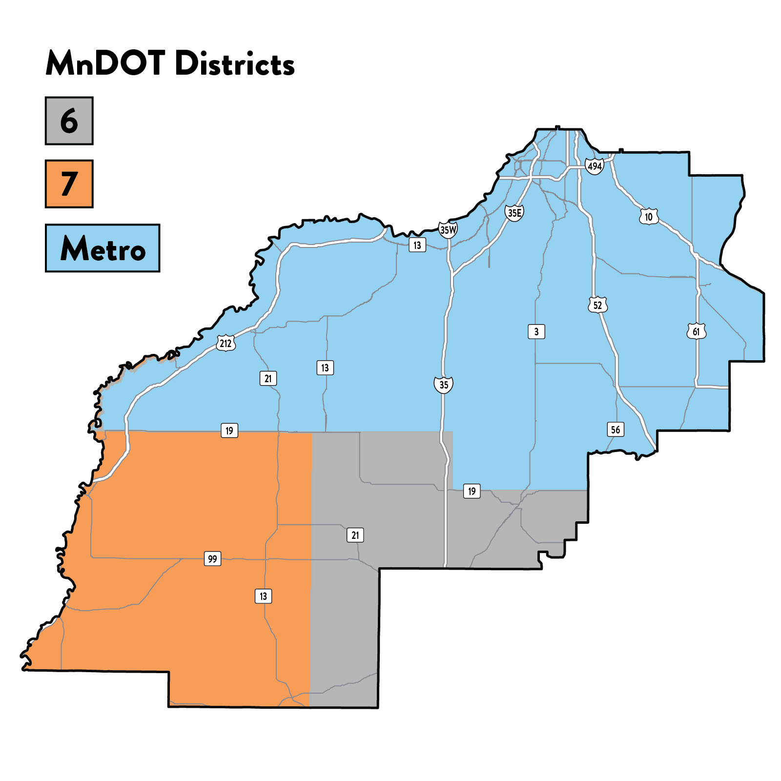 The Metropolitan Council is the MPO for the Twin Cities and surrounding metropolitan area. The MPO covers the northern portion of the congressional district (the counties of Scott, Dakota, and Washington), while regional development organizations cover the southern portion (Le Sueur and Rice counties).