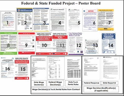The posterboard is an exhibit containing various posters that are required by state and federal law. The prime contractor is responsible to construct a posterboard that contains all required posters and place it on the project site of work.