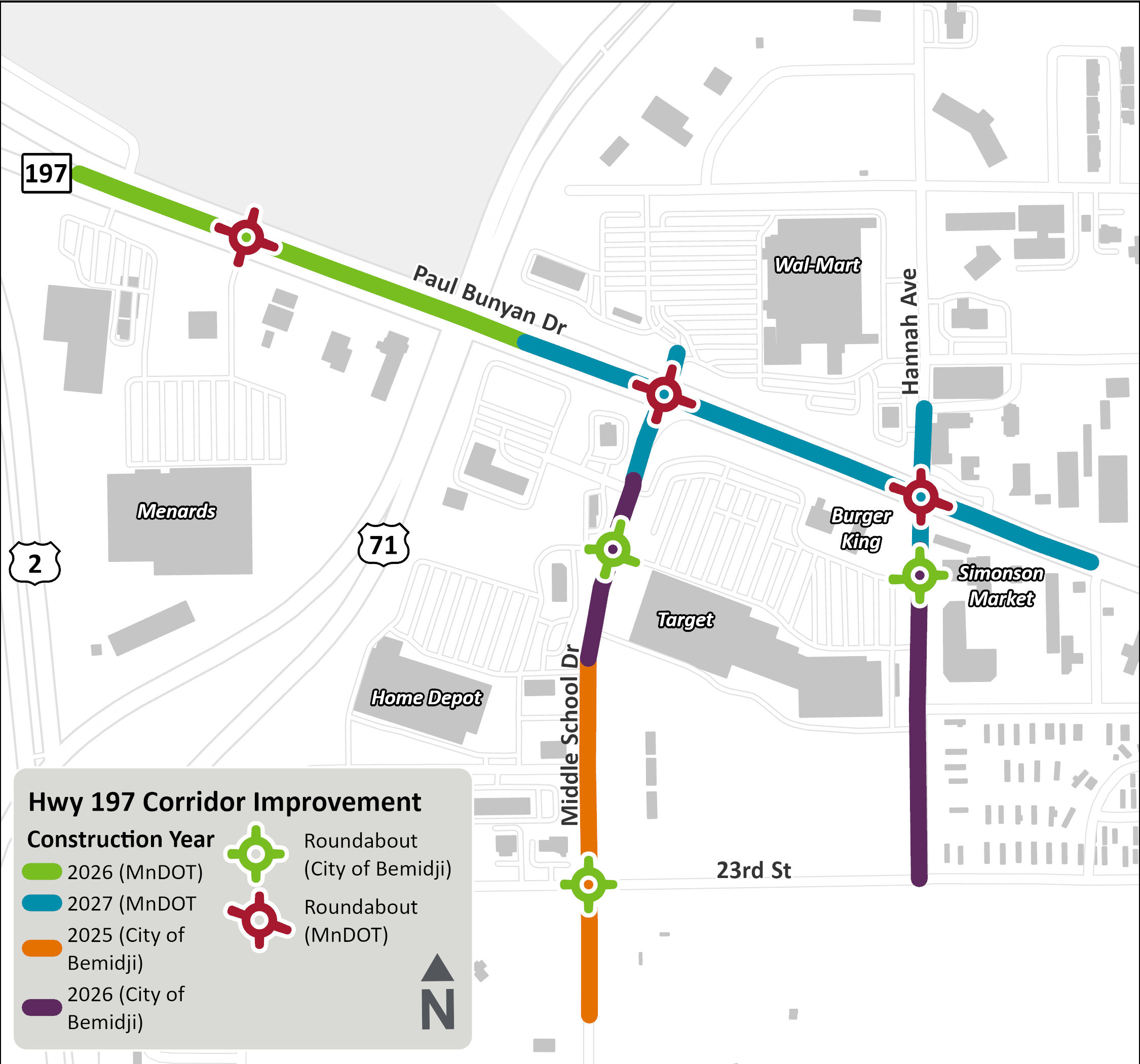 Between MnDOT and the City of Bemidji, six roundabouts will be constructed between 2025 and 2027. MnDOT will replace the signalized intersections along Hwy 197 at Hannah Avenue, Middle School Drive, and the Menard's access road.