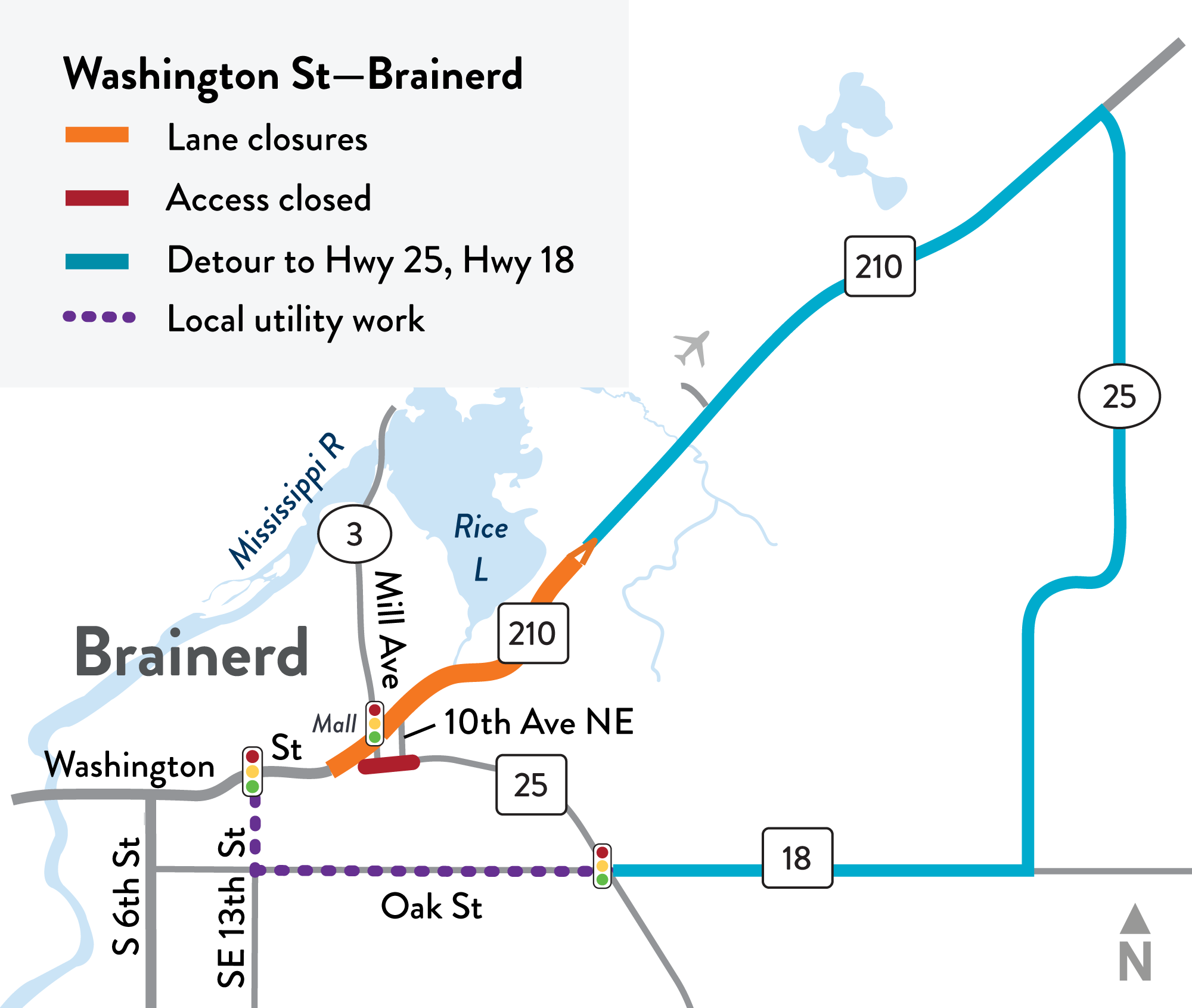 - Detour via Hwy 210 west of Brainerd, Crow Wing Co. Rd. 25 and Hwy 18
