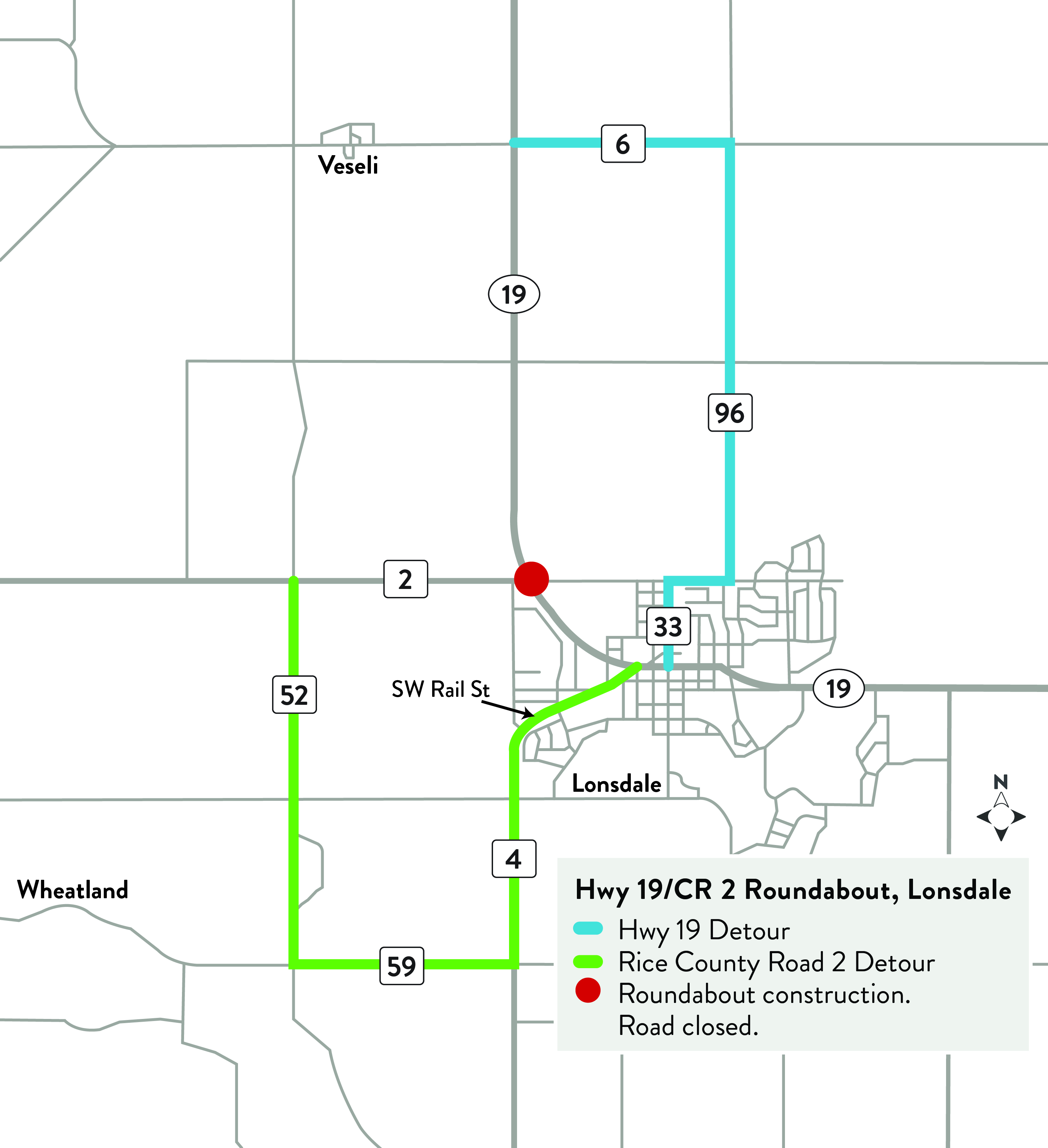 Construction of a roundabout at Hwy 19 and Rice Co. Rd. 2 is scheduled to begin May 4, 2026 north of Lonsdale to improve intersection safety and traffic mobility. Work is expected to be completed in July.