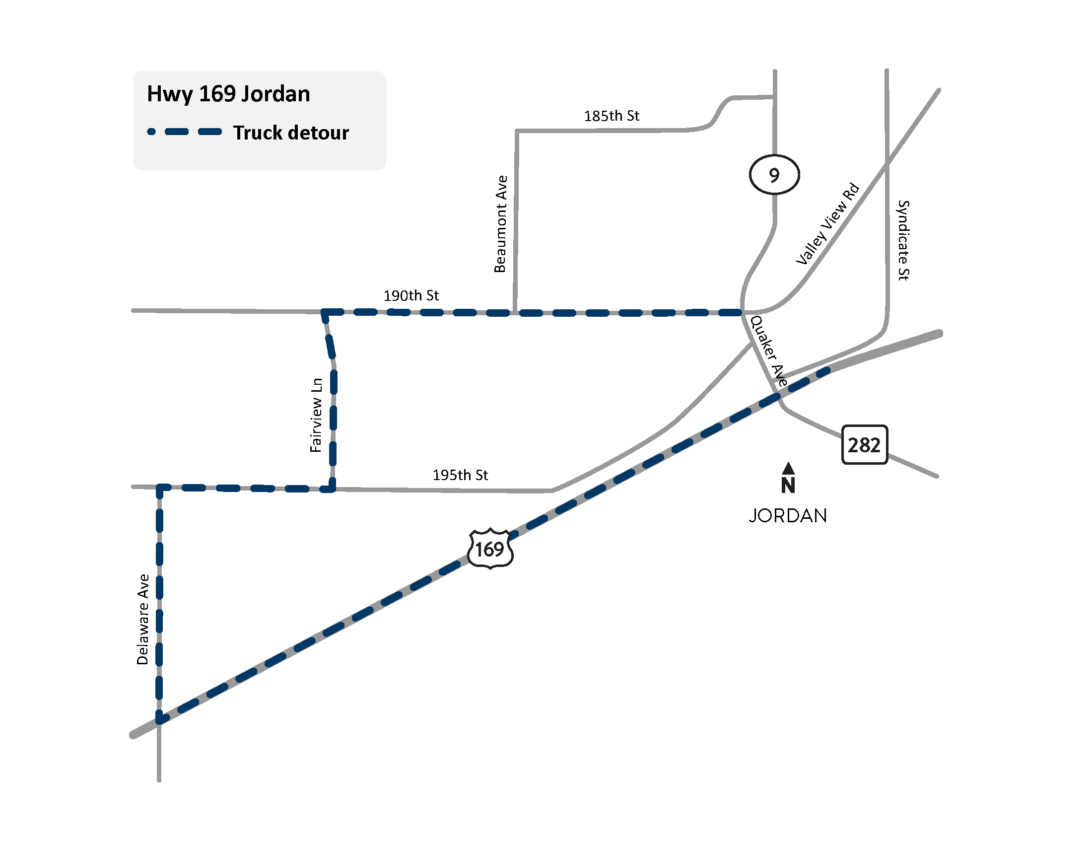 - Truck traffic exiting and entering Hwy 169 at Co. Rd. 9 will instead be detoured to Delaware Ave./Co. Rd. 59