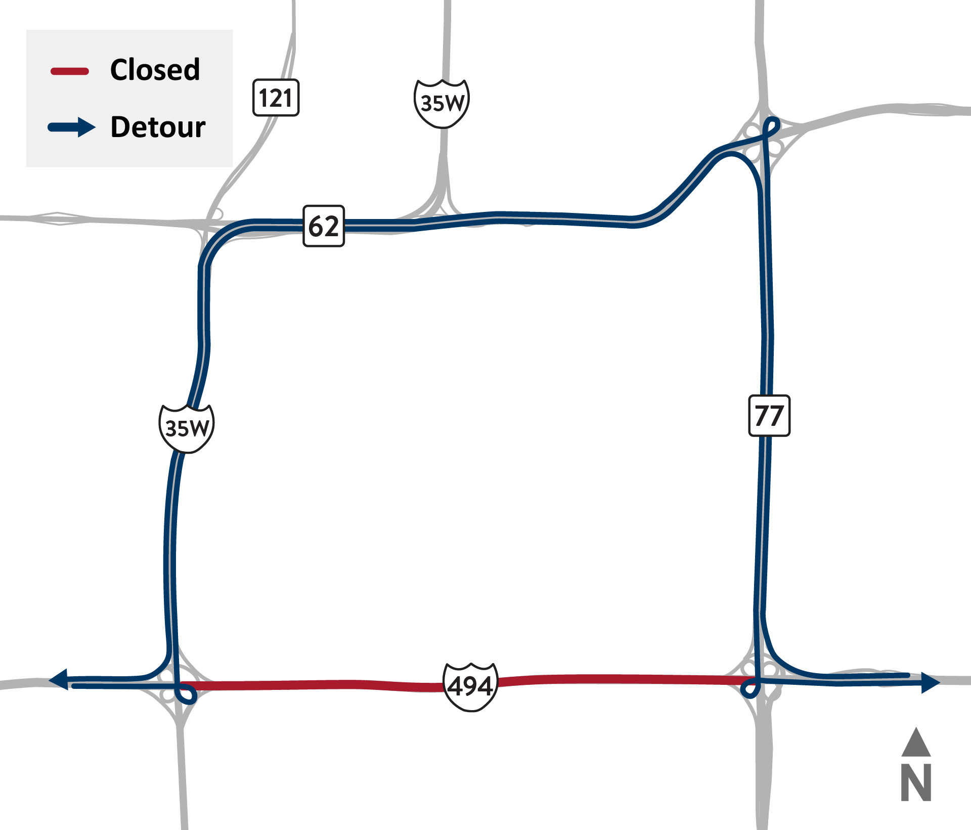 - I-494 is closed in both directions between I-35W and Hwy 77